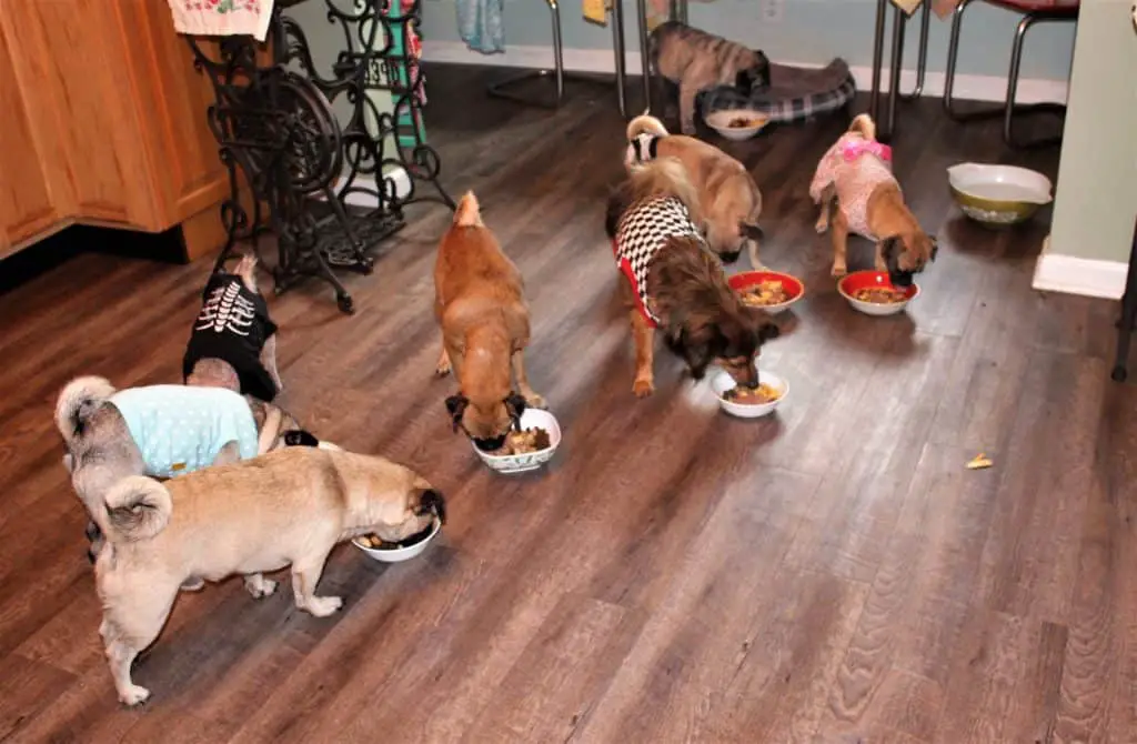 A Chug usually needs about ½ to 1 cup of high-quality dry food a day. This should be spread up into two separate meals for them.